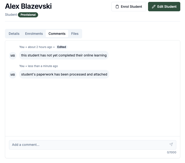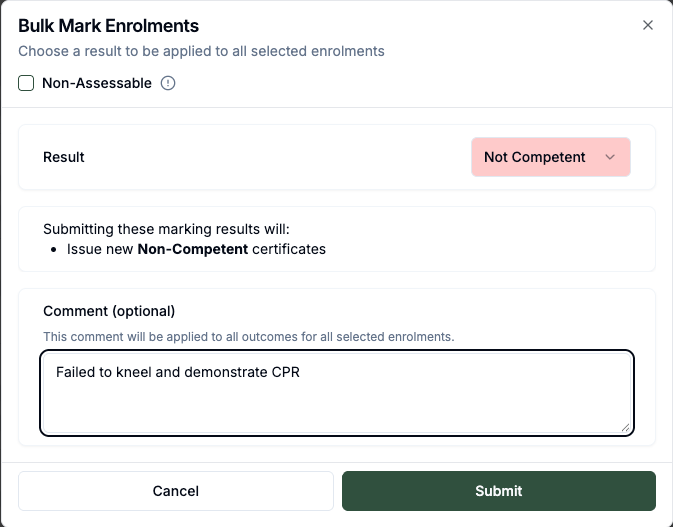 Trainers can now add comments to individual outcomes, providing feedback that helps track student progress and assessment decisions. These comments will be stored on the student enrolment profile to maintain a log for audit purposes.